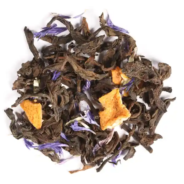Rojo pu Erh Cáscara de Naranja Granos de Cacao Aciano Azul y Esencia Natural de Chocolate y Naranja.