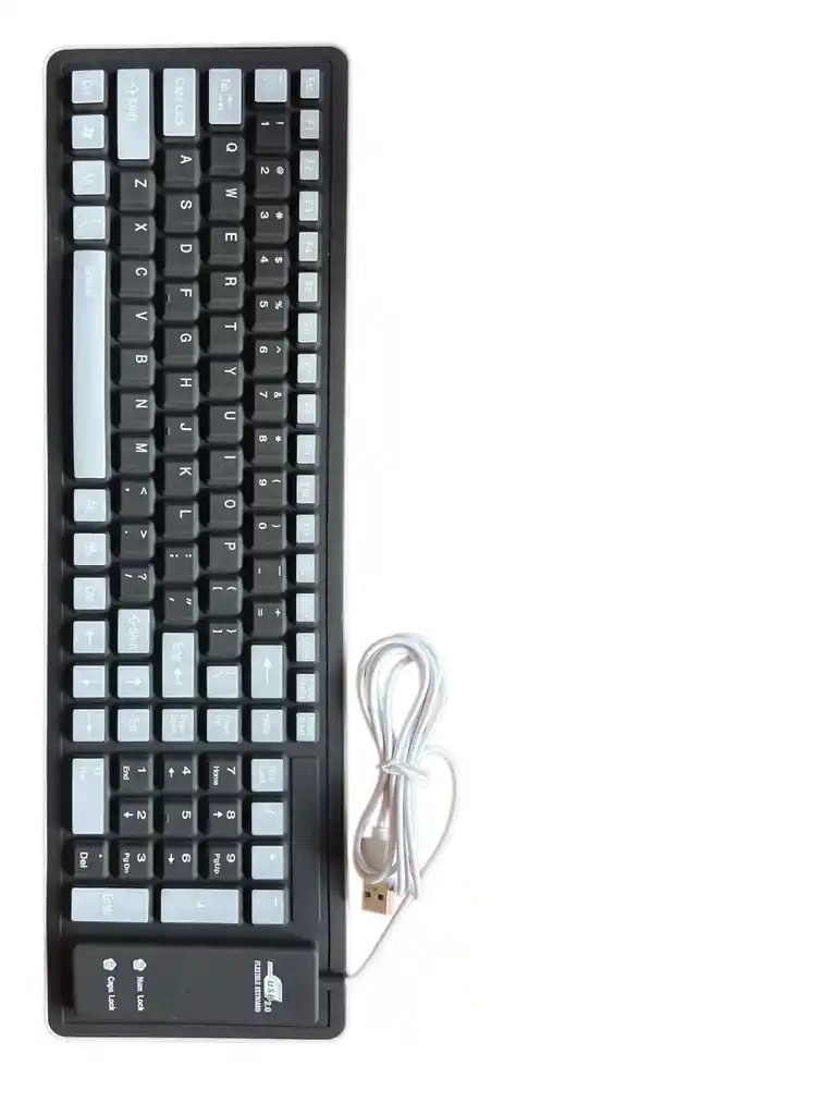 Teclado de silicona con conexión USB, diseño flexible y teclas silenciosas. Compatible con PC y notebook.