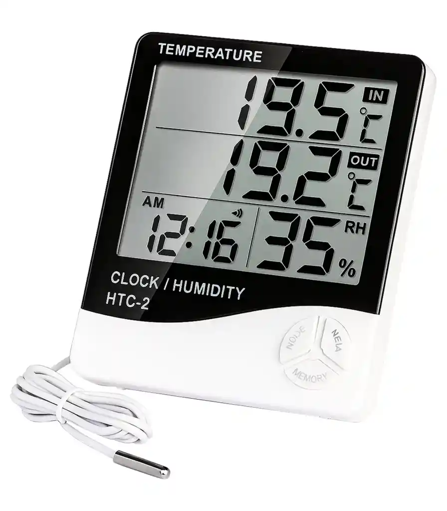 El termohigrómetro digital Kasvi HTC-2 permite medir temperatura interior, temperatura exterior mediante sonda y humedad relativa con lectura simultánea en una sola pantalla. Es ideal para cultivo indoor, carpas, salas de propagación y secado, ayudando a mantener condiciones ambientales estables. La sonda externa cableada facilita medir la temperatura directamente en la canopia u otros puntos críticos, mientras el dispositivo queda visible para una lectura cómoda. Incluye memoria MAX/MIN, reloj, alarma y cambio entre °C/°F, lo que permite detectar picos de temperatura o humedad y ajustar ventilación o humidificación a tiempo. Funciona con una pila AAA (incluida), es liviano, preciso y muy fácil de usar, perfecto para monitoreo diario continuo.