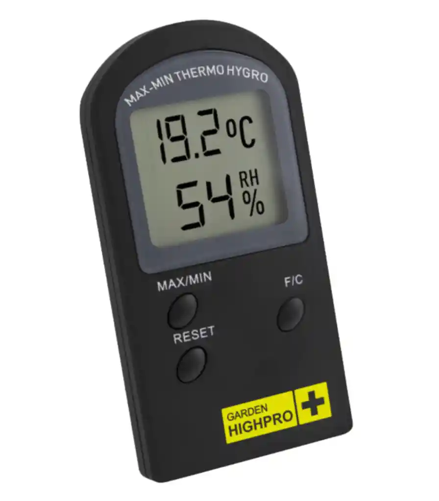 El Termohigrómetro ProHygro Basic de Garden Highpro es una herramienta esencial para controlar el ambiente de cultivo interior, proporcionando mediciones de temperatura y humedad precisas y fiables. Su capacidad para registrar valores máximos y mínimos diarios te ayuda a ajustar tus prácticas de cultivo para garantizar un entorno estable y propicio para el crecimiento saludable de tus plantas.