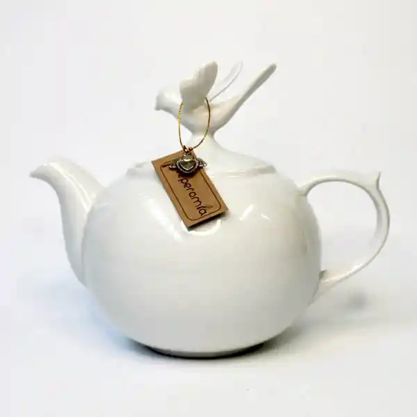 tetera de cerámica blanca fina con tapa decorada con delicado diseño de torcaza. Elegante y perfecta disfruta de tus infusiones con estilo.