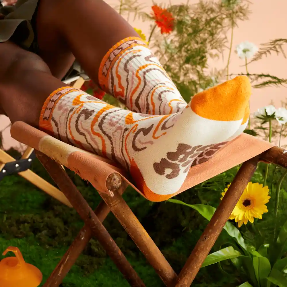 Con The Joy of Socks, añade estilo a tus pasos. Estos calcetines de algodón orgánico tienen estampado el mensaje "happy hippy" en el puño para sacar tu lado más hippie.