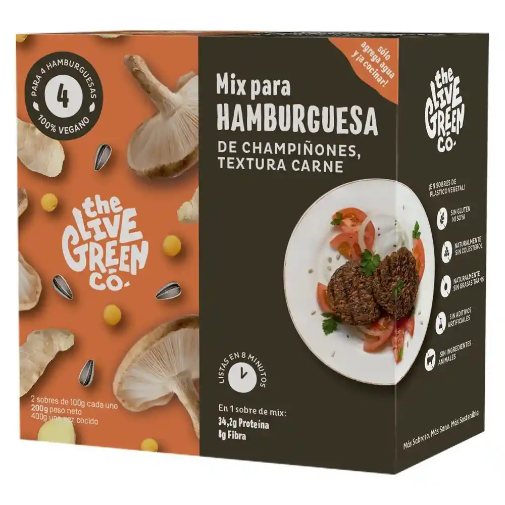 "Mix para hamburguesas de champiñones, textura carne Solo hechas con plantas, nada más. Listas en 8 min. Solo agrega agua, arma tu hamburguesa ¡y cocina! Ingredientes 100% naturales: Proteína de arvejas, semillas de maravillas, champiñones, garbanzos, porotos negros, lentejas, mandioca, tomate, linaza, arroz, cebolla, ajo, jengibre, cilantro, nuez moscada, sal de mar y nada más."