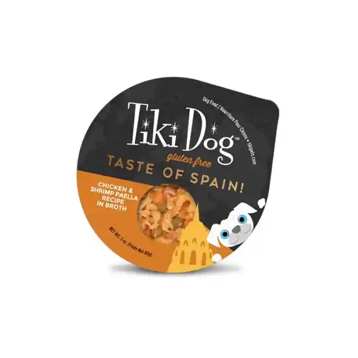 Tiki Dog™ Taste of the World “Chicken & Shrimp Paella” es una receta húmeda inspirada en la cocina española, perfecta para perros de todas las edades. Presentada en un generoso y sabroso caldo de pollo, combina pollo desmenuzado, arroz integral, camarones enteros, zanahorias, guisantes y un toque de jamón, todo elaborado con ingredientes no transgénicos y reconocibles.