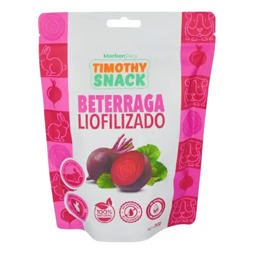 La Liofilización es un proceso que consiste en congelar frutas o verduras y luego eliminar el agua mediante sublimación en vacío, conservando su sabor, textura y nutrientes sin necesidad de conservantes. Ingredientes: 100% Beterraga Recomendación: Adecuado para conejos, cobayos, chinchillas, hámster y roedores en general. Alimento complementario a la dieta, sin embargo puede suministrarse sin restricciones. Contenido: 30 gr.