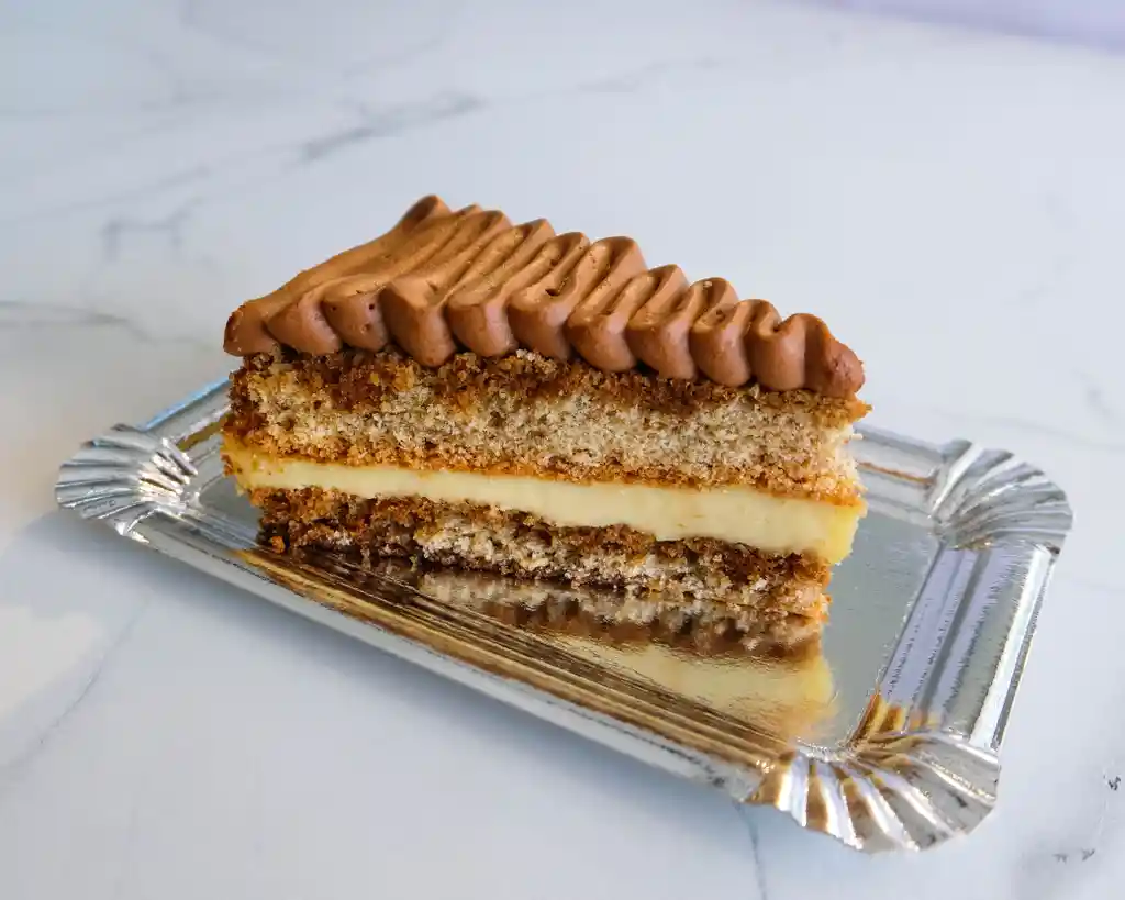 Bizcocho de harina integral relleno de suave mousse de queso crema, café descafeinado, almibar de amaretto y vainilla, cubierto por ganache montada de chocolate. 222 kcal por porción.