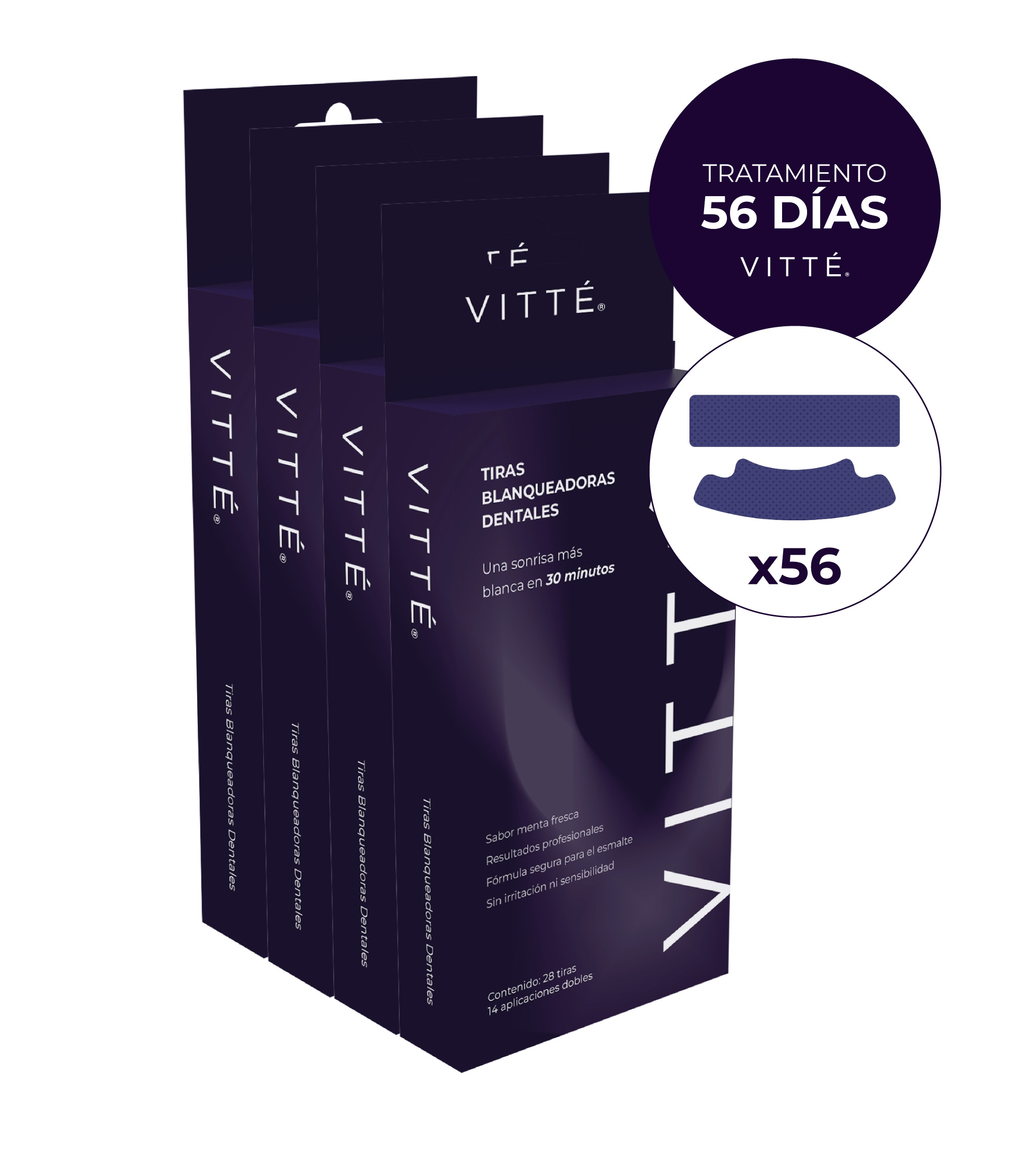4 Cajas (56 días) - Recomendado por expertos Nuestro tratamiento más completo para una sonrisa visiblemente más blanca y resultados que se mantienen en el tiempo. Tiras blanqueadoras dentales VITTÉ – Tratamiento profesional en casa. Las tiras blanqueadoras VITTÉ están diseñadas para eliminar manchas profundas y devolver a tus dientes un blanco natural y brillante. Con nuestra fórmula exclusiva y segura, disfrutarás de un tratamiento profesional, rápido y cómodo que respeta la salud de tu esmalte sin causar sensibilidad. Gracias a la tecnología avanzada de nuestro gel blanqueador, las tiras se adaptan perfectamente a la forma de tus dientes para maximizar el contacto y la efectividad durante 30 a 60 minutos de uso diario. ¿Cómo funcionan? Cada tira libera un gel blanqueador especialmente formulado con ingredientes profesionales que actúan directamente sobre las manchas incrustadas bajo el esmalte. Su flexibilidad y adherencia aseguran un contacto constante y uniforme, por eso es importante aplicar las tiras sobre dientes limpios y completamente secos, ya que la humedad puede reducir su efectividad. El resultado: un blanqueamiento homogéneo sin dañar la superficie dental. ✅ Uso sencillo y rápido✅ Sin sensibilidad ni irritación✅ Resultados visibles en pocos días✅ Seguro para el esmalte dental✅ Compatible con coronas y empastes (sin efecto sobre ellos) Ingredientes: 💫 Phthalimidoperoxycaproic Acid (PAP): Ingrediente activo que elimina manchas sin dañar el esmalte.🦠 Xylitol: Promueve la salud bucal y combate las bacterias.💧 Glycerol y Polymethacrylates: Proporcionan hidratación y adhesión óptima del gel.🦷 Ingredientes seguros y aprobados para un blanqueamiento profesional. Beneficios principales: 🌟 Sonrisa más blanca y luminosa🛡️ Fórmula segura y sin daño al esmalte🪥 Aplicación cómoda y sin molestias⏱️ Tratamiento rápido y efectivo🍃 Frescura agradable con sabor a menta Precauciones y recomendaciones: No comer, fumar ni beber (excepto agua) durante el uso. Mantener fuera del alcance de niños y evitar contacto con ojos. No recomendado para menores de 18 años. Consulta con tu dentista si tienes dudas o tratamientos dentales específicos. Contenido del empaque: 112 tiras (56 aplicaciones)