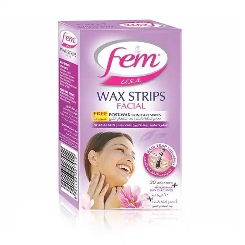 Tiras de Cera Facial Caléndula ------------------------------ Piel normal Las tiras de cera Fem te brindan esa suavidad duradera que siempre has deseado en 3 simples pasos. Formuladas con extractos de flores que se adaptan a su piel normal, las tiras de cera Fem son la solución perfecta para sus necesidades de depilación. Contenido: 20 Tiras de Cera (10x2) reutilizable 4 Post-Wax toallitas para el cuidado de la piel Instrucciones