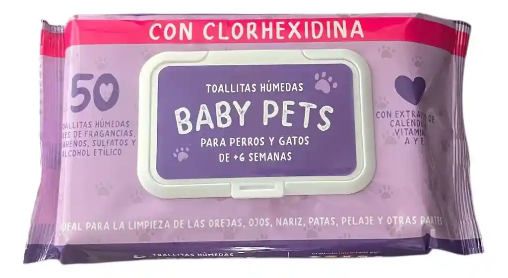 Toallitas humedas de la marca babypets, en formato de 50 unidades. A diferencia de las toallitas húmedas tradicionales, están contienen clorhexidina, la cual ejerce un efecto desinfectante en situaciones en que es necesario.