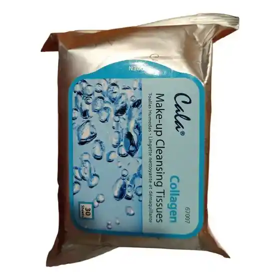 Toallitas desmaquillantes Cala Collagen que eliminan maquillaje, suciedad e impurezas mientras aportan hidratación gracias a su contenido de colágeno, ayudando a mantener la piel suave, flexible y con apariencia saludable; ideales para limpieza rápida y efectiva sin resecar la piel, aptas para todo tipo de piel. Contenido: 30 unidades. Uso externo.