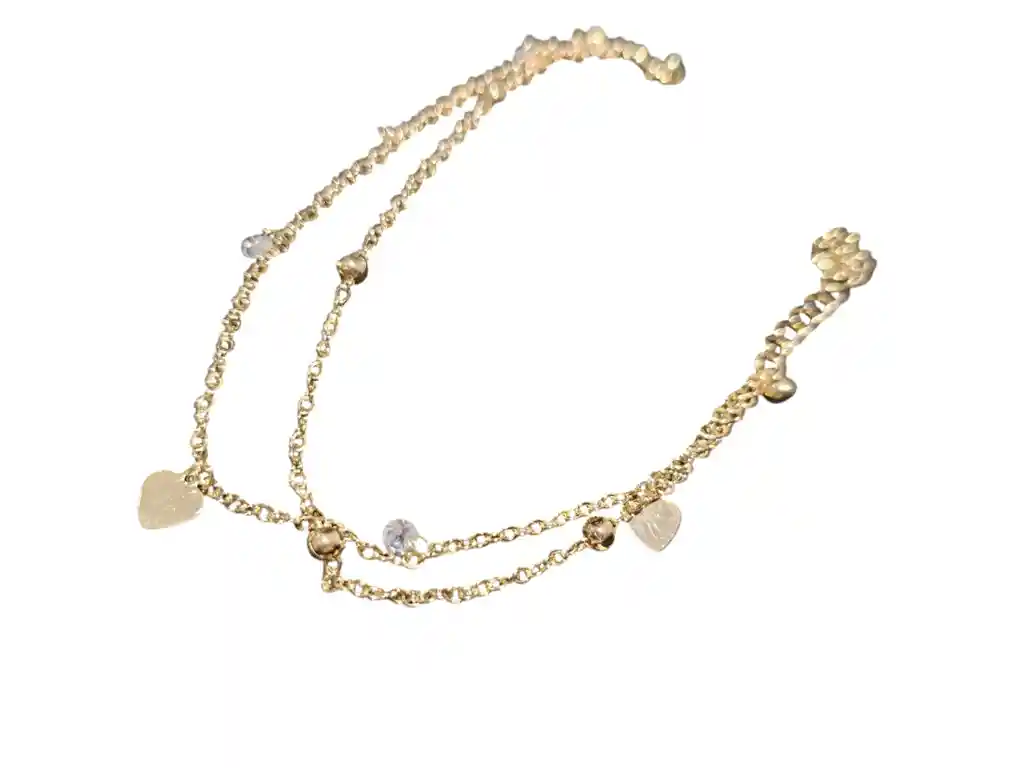 Tobillera bañada en oro con delicada cadena decorada con dijes de corazones, cristales brillantes y pequeñas esferas que aportan movimiento y luminosidad. Su diseño femenino y sofisticado equilibra elegancia y frescura, creando un detalle sutil que realza el tobillo con un brillo refinado. Ideal para complementar looks veraniegos o dar un toque delicado y romántico a cualquier outfit.