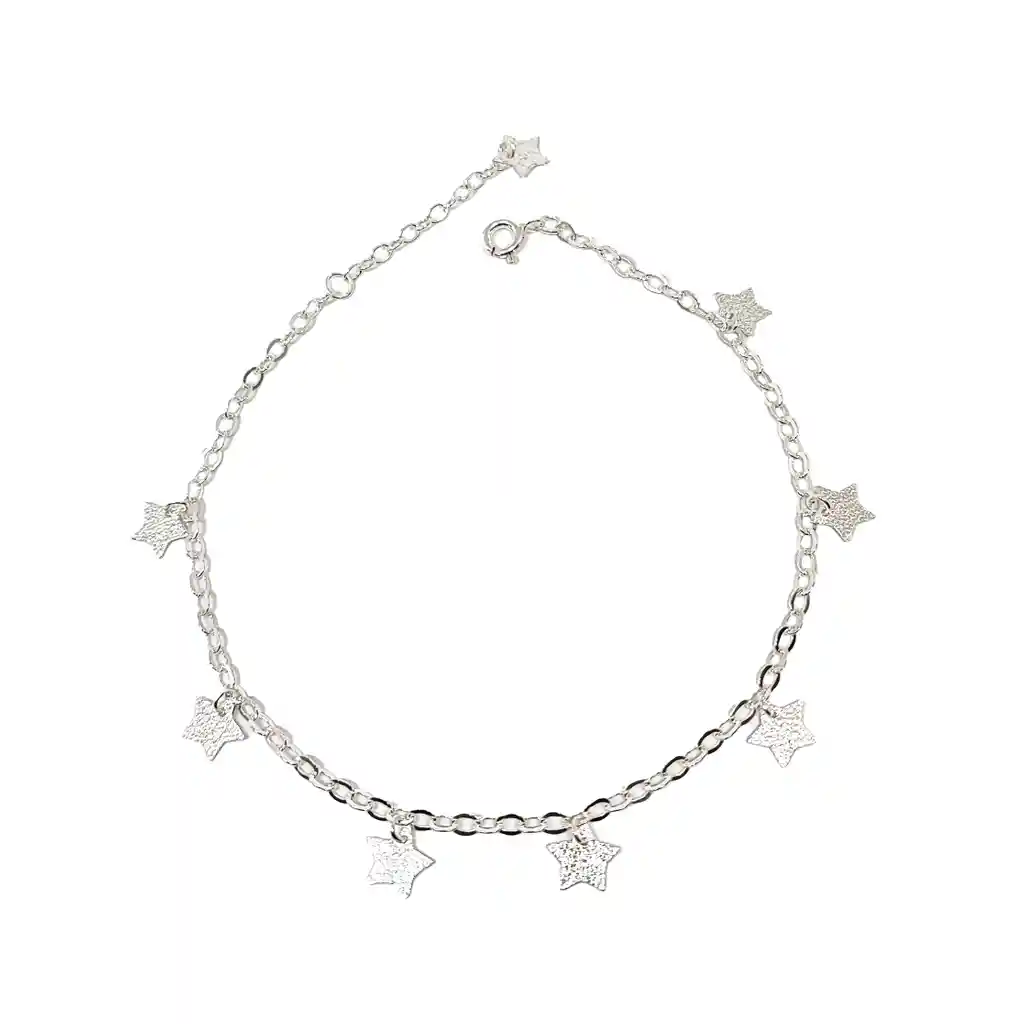 Embellece tus tobillos con nuestra encantadora Tobillera Estrellas Satinadas, una joya única en Plata Fina 925. Cada estrella satinada a lo largo de la tobillera agrega un toque de brillo sutil y elegancia a tu estilo. La Plata Fina 925 garantiza una calidad excepcional, proporcionando durabilidad y un acabado satinado que resalta la belleza de cada estrella. Sus medidas son 22+4cm de cadena de extensión de la tobillera. Cada estrella es de 7mm de diámetro. Tiene un peso de 3 gr.