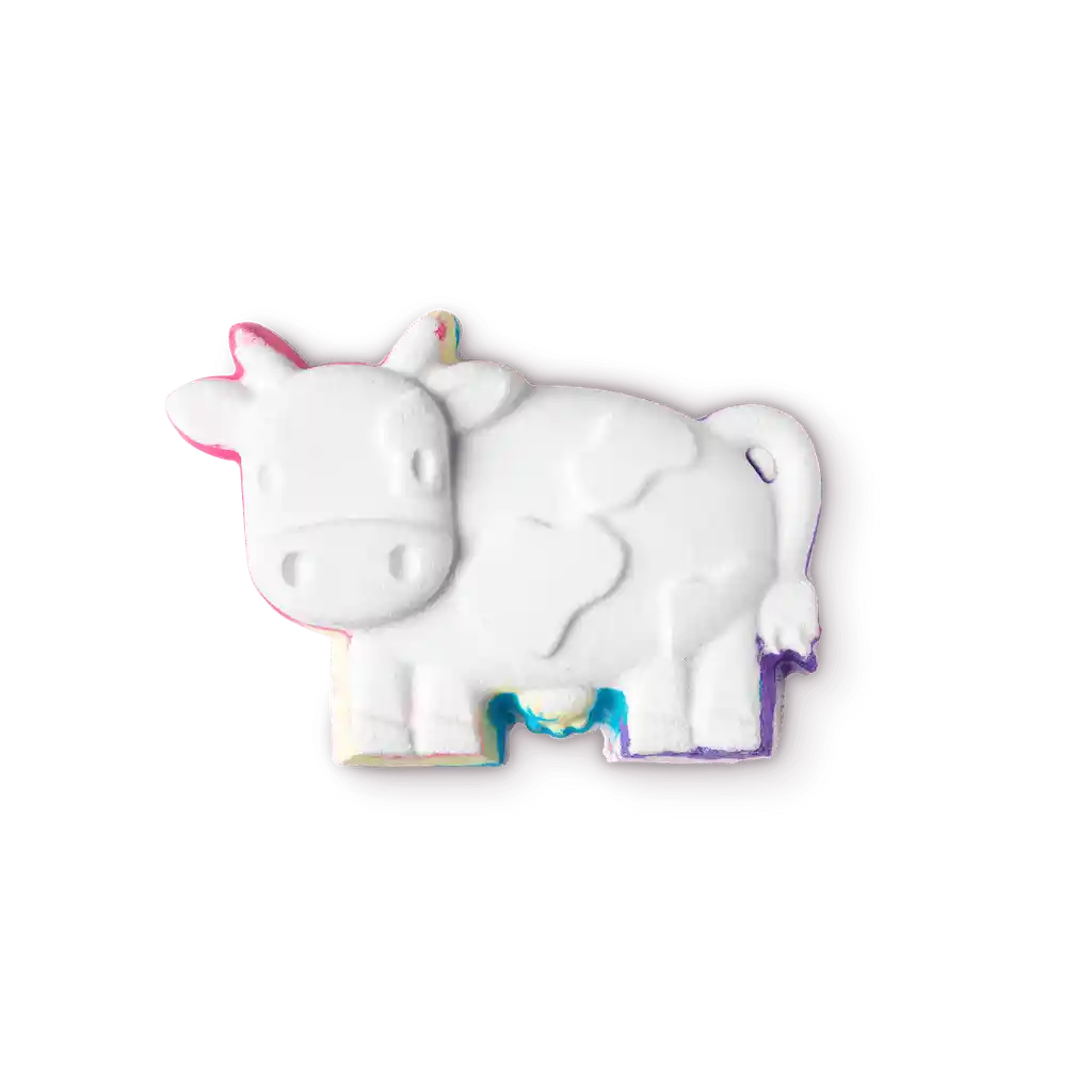 Sumérgete en suavizantes aguas multicolor con esta simpática vaca, llena de leche de coco en polvo y aceite de naranja.