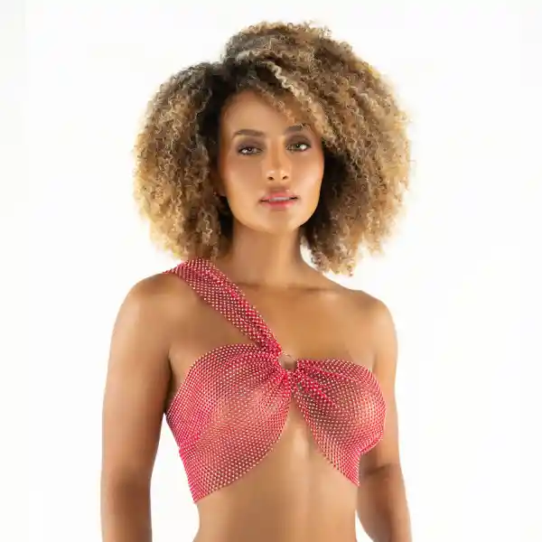 Destaca con este elegante y sensual top de malla color cereza, diseñado para adaptarse perfectamente a cualquier talla gracias a su tela elástica. Con una sola tira que realza un hombro y un detalle de argolla en el frente y en la espalda, este top combina comodidad y estilo. Las incrustaciones de brillantes en la tela añaden un toque de glamour, haciéndolo ideal para lucir espectacular en cualquier ocasión especial.