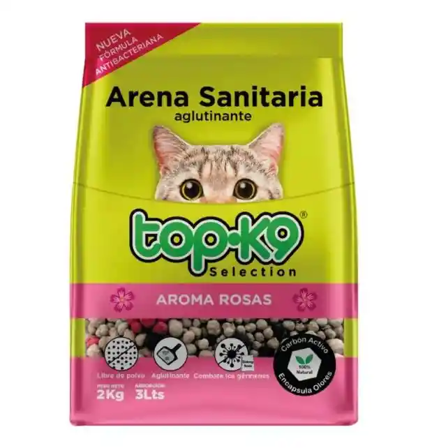 Arena Sanitaria Aglutinante Antibacteriana Top K9 es una gravilla mineral 100% natural, que absorbe en 8 segundos aproximadamente la orina de su gato transformándola en una bolita fácil de retirar. Posee partículas de carbón activo que eliminan el 99% de los desagradables olores y baking soda que ayuda a eliminar un 99% las bacterias, además de indicadores de colores de aroma, permitiendo disfrutar de agradables aromas al usar estas arenas.