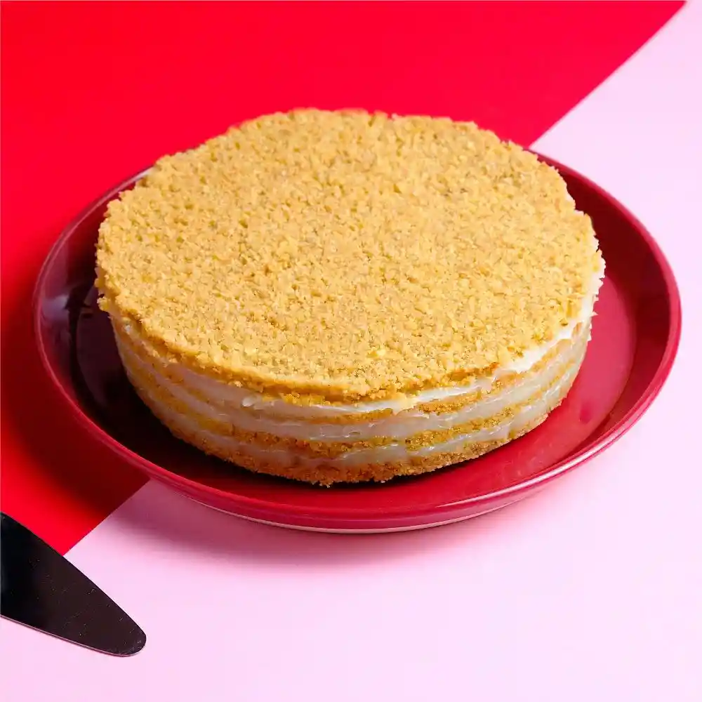 Capas de crumble de nuez, rellenas de una suave caluga artesanal. Formato: 15 personas. *PRODUCTO CONGELADO