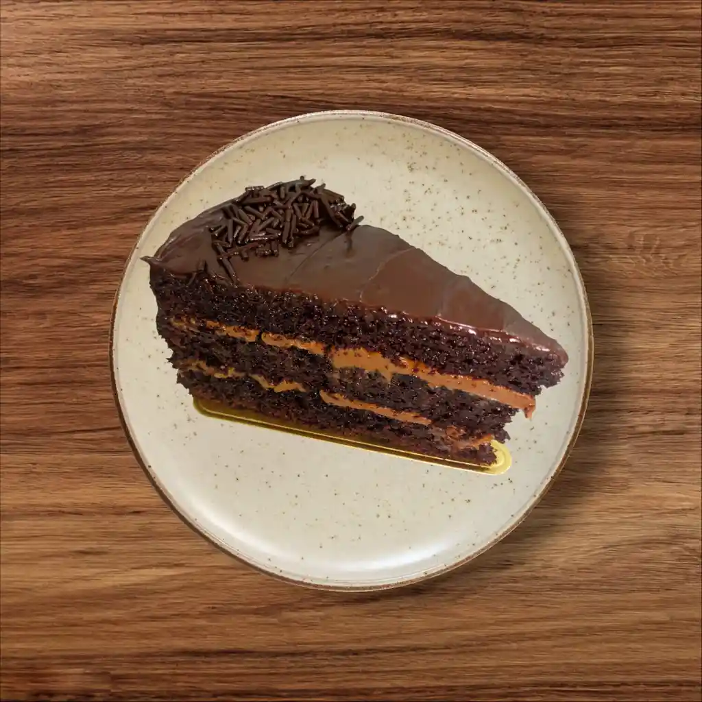 Bizcocho de chocolate americano, relleno con manjar y por arriba una capa delgada de ganache de chocolate