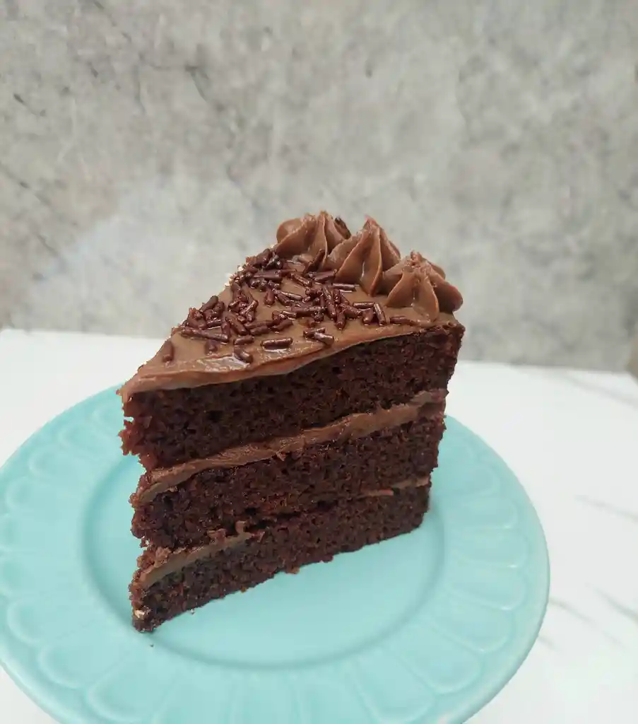 Húmedo Bizcocho relleno de ganache y Forrado en ganache de chocolate.