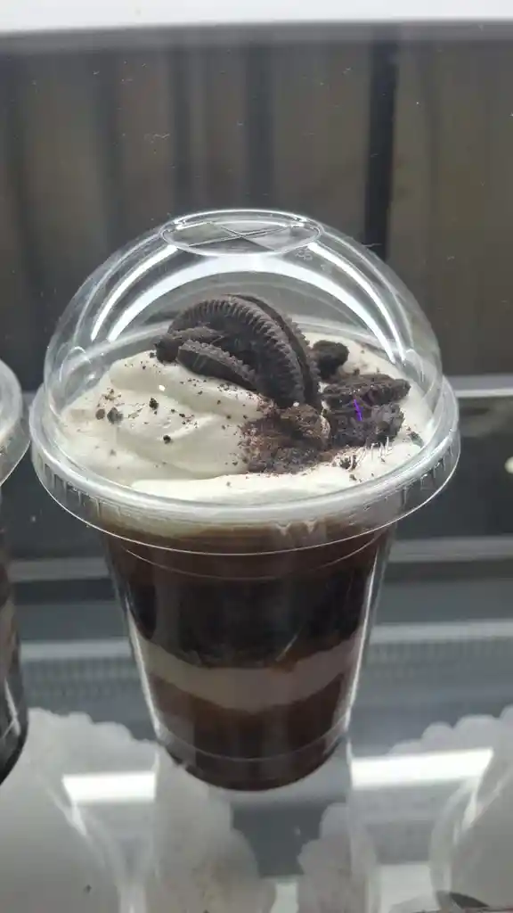 Clásica torta tres leches en vaso. Pastelera, manjar y chantillí.