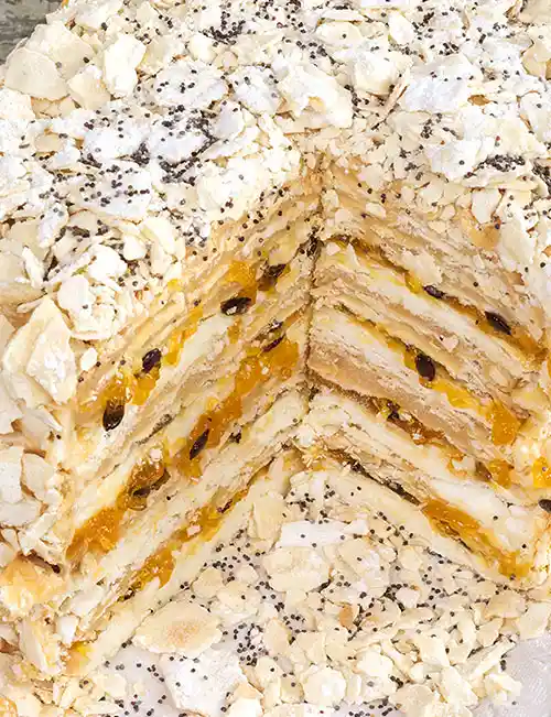 Delgadas capas de hojarascas, rellenas con manjar blanco casero, crema chantilly levemente endulzada y aromática salsa de pulpa de maracuyá. Diametro aproximado 12cm altura 5.5cm