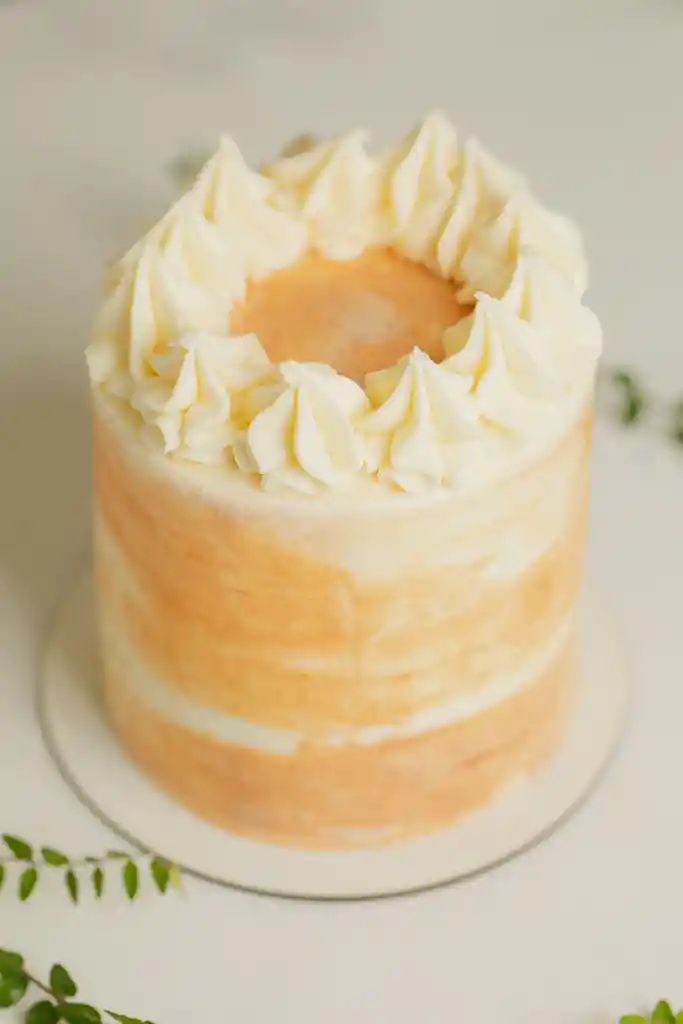 Torta sin Gluten (harina de arroz, maicena y mandioca. No apto para celiacos) para 6 a 8 personas de bizcocho de vainila relleno de frosting y manjar. Decorado con frosting de color blanco con manchas de color café claro y pompones blancos.