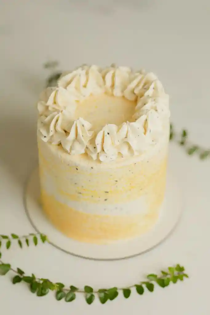 Torta vegana (Sin lacteos, sin huevo) para 6 a 8 personas de bizcocho de vainilla relleno de buttercream y salsa de maracuyá. Cubierta de buttercream de maracuyá de color amarillo palido y pompones del mismo color.