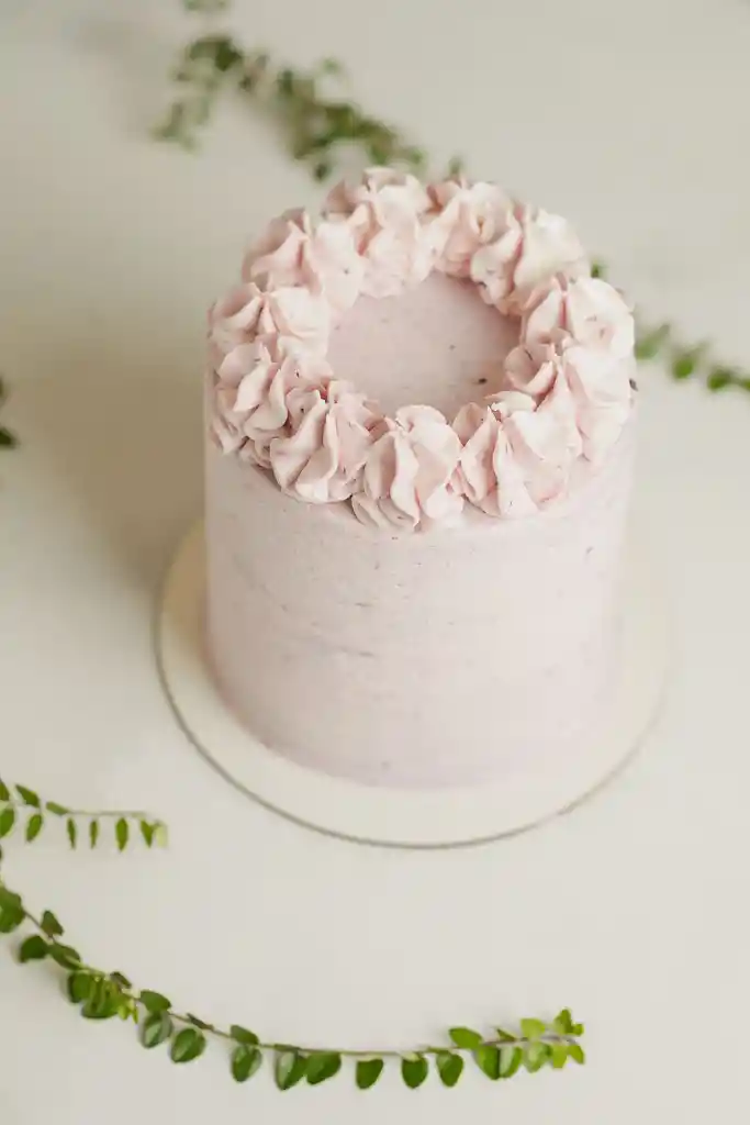 Torta sin Gluten y sin lacteos (con leche de coco, harina de arroz, maicena y mandioca. No apto para celiacos) para 6 a 8 personas de bizcocho de vainilla relleno de buttercream de limón y mora. Cubierto de buttercream de limón de color rosado palido y pompones del mismo color.
