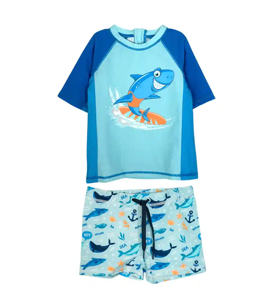 Traje de baño de dos piezas con cierre en la parte trasera de la camiseta manga corta, y cordon ajustable en el short. Lindo diseño de tiburón. Entrega a tu bebé la protección UV necesaria para disfrutar de la playa o la piscina.