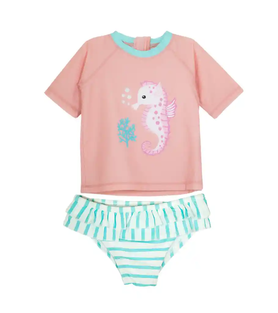 Traje de baño de dos piezas cierre en la parte trasera de la camiseta manga corta, con lindo diseño de caballito de mar. Entrega a tu bebé la protección UV necesaria para disfrutar de la playa o la piscina.
