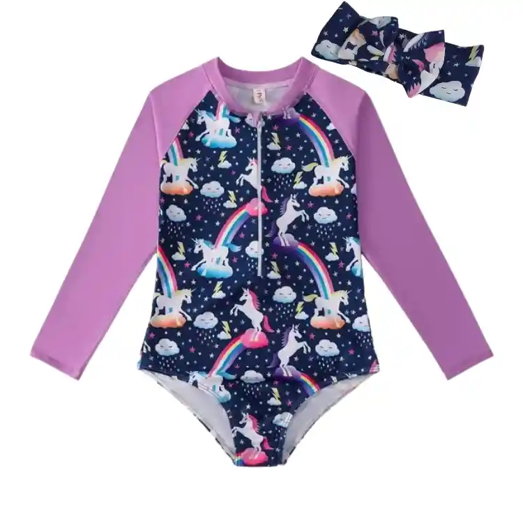 Haz que cada día de playa o piscina sea mágico con nuestro encantador traje de baño para niñas de 3 a 4 años. Este adorable diseño cuenta con mangas largas que brindan una excelente protección solar, perfectas para disfrutar del sol de manera segura. El estampado colorido de unicornios y estrellas encantará a cualquier pequeña aventurera. Incluye un cintillo a juego que complementa el look y asegura que tu niña se sienta cómoda y a la moda. Fabricado con materiales suaves y de alta calidad, este traje de baño es ideal para actividades acuáticas, garantizando libertad de movimiento y comodidad durante todo el día.