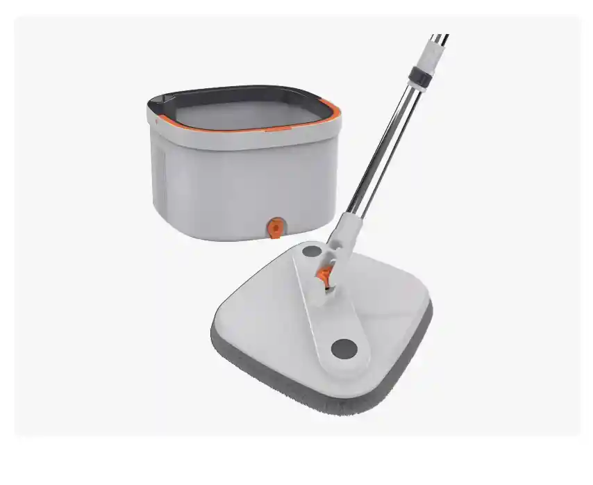 La Super Mopa Lite 360° incluye un balde con sistema de centrifugado y un despiche para drenar el agua. Cuenta con una manilla para facilitar su traslado. El mecanismo se activa al presionar el mango dentro del balde, provocando que la mopa gire y expulse el agua, separando la suciedad del agua limpia. Un cepillo integrado limpia la mopa mientras se humedece con agua fresca. Su diseño permite alcanzar espacios reducidos, como debajo de muebles, gracias a su cabezal giratorio.