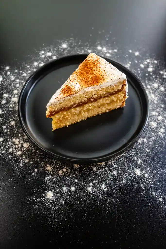 Bizcocho húmedo de vainilla bañado en mezcla de tres leches y esencia de licor, relleno con crema pastelera y manjar. Cubierta con crema chantilly