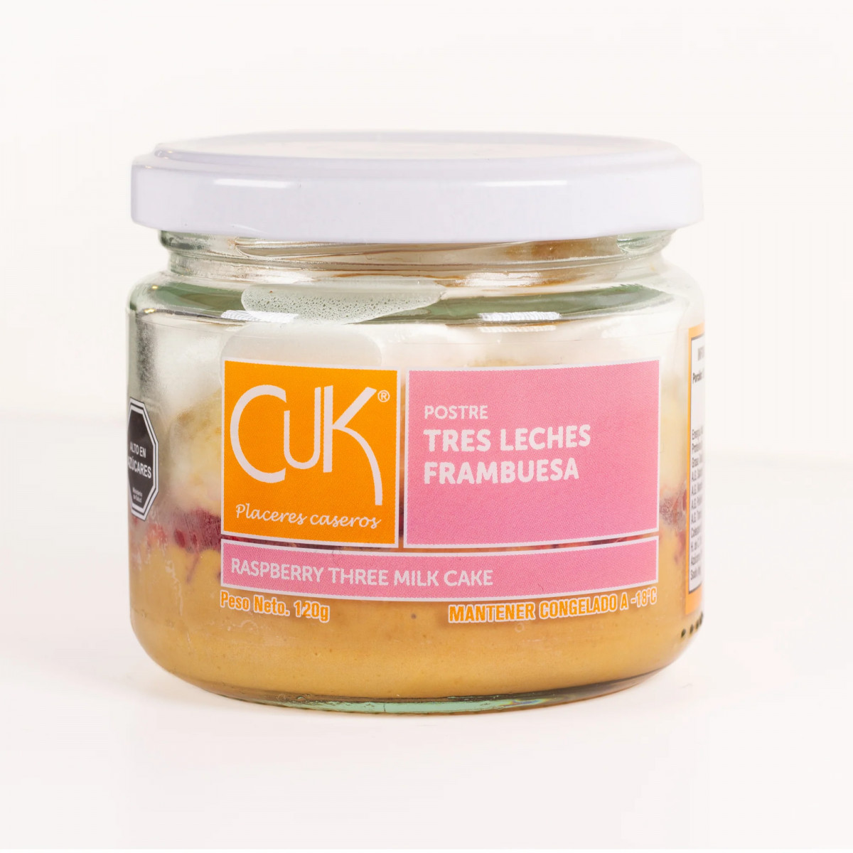 Peso neto: 120 grs. Mantener congelado a -18 C, duración 12 meses. Ingredientes: Mezcla tres leches (bizcocho (azúcar, harina de trigo, leche descremada, almidón de maíz, emulsionantes (sales de ácidos grasos (con base de Ca, Na y K), mono y diglicéridos deácidos grasos, ésteres lácticos y de ácidos grasos del glicerol, ésteres diacetiltartaricos y de los ácidos grasos del glicerol, ésteres de propilenglicol de ácidos grasos, estearoil lactilatode calcio), maltodextrina, bicarbonato de sodio, saborizante artificial vainilla, fosfato de sodio y aluminio, saborizante artificial naranja, difosfato disódico, cremor tártaro, ácido tartárico, cloruro de sodio), leche condensada (leche parcialmente descremada y azúcar), leche descremada sin lactosa (leche descremada, enzima lactasa), crema sin lactosa(crema de leche natural, espesante (carboximetilcelulosa,carragenina), enzima lactasa y colorante indigotina) y leche evaporada (leche descremada, aceite vegetal de palma y estabilizante (ortofosfato de sodio)), frambuesas, manjar con leche (manjar (leche entera, azúcar, agar, fosfato disódico, bicarbonato de sodio), leche descremada sin lactosa (leche descremada, enzima lactasa) y merengue (azúcar, clara de huevo, agua y goma xanthan).Contiene: Lácteos, huevos y gluten. Elaborado en instalaciones que también procesan: Crustáceos, pescados, maní, soya y nueces.