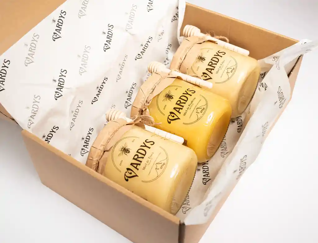 Nuestra trilogía de mieles Vardys disponibles en formato de 570 gramos Ulmo, Tiaca y Praderas Mézclalas como más de guste y recíbela en nuestra Vardysbox directo en tu hogar. Lo mejor de la naturaleza, miel pura y natural sin ningún proceso, aditivo ni contaminante. Origen Volcán Puntiagudo, Lago Todos Los Santos. PRESENTACÍON EN VARDYSBOX TODAS CON DIPPER (CUCHARA DE MADERA)