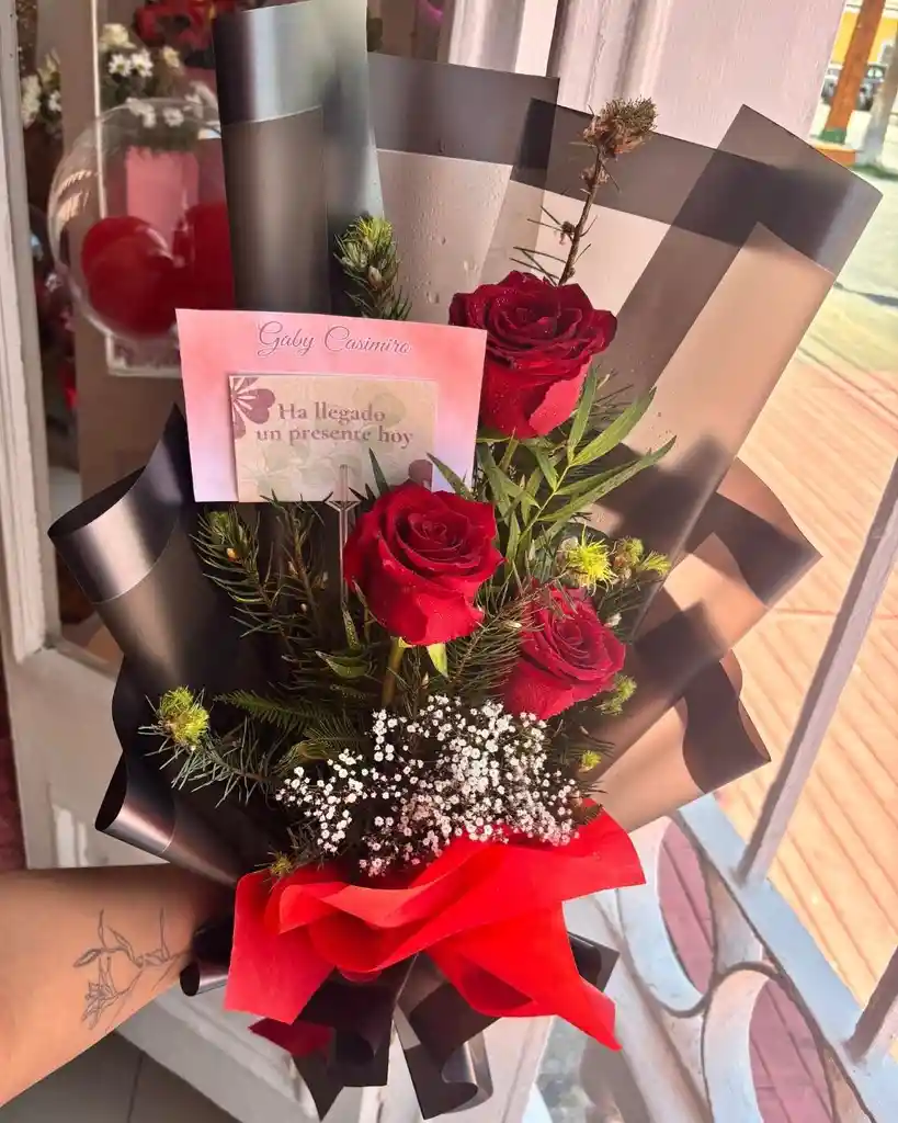 “Lo simple también puede ser profundo.” Ramo elegante compuesto por tres rosas rojas de intenso color, envueltas en papel negro que realza su carácter y sofisticación. Su diseño sobrio y moderno lo convierte en un detalle ideal para expresar sentimientos con fuerza y estilo, demostrando que a veces menos es más. Perfecto para sorprender con un gesto directo, significativo y lleno de intención.