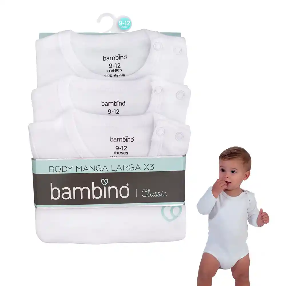 Especificaciones: Marca: Bambino. Material: Algodón. Tallas: 9-12 meses (según Disponibilidad). Género: Niña / Niño. Contenido: Set de 3 Bodys.