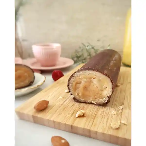 Uno de nuestros imperdibles. exquisito tronco de manjar almendra bañado en un rico chocolate 60 cacao. para 8 personas