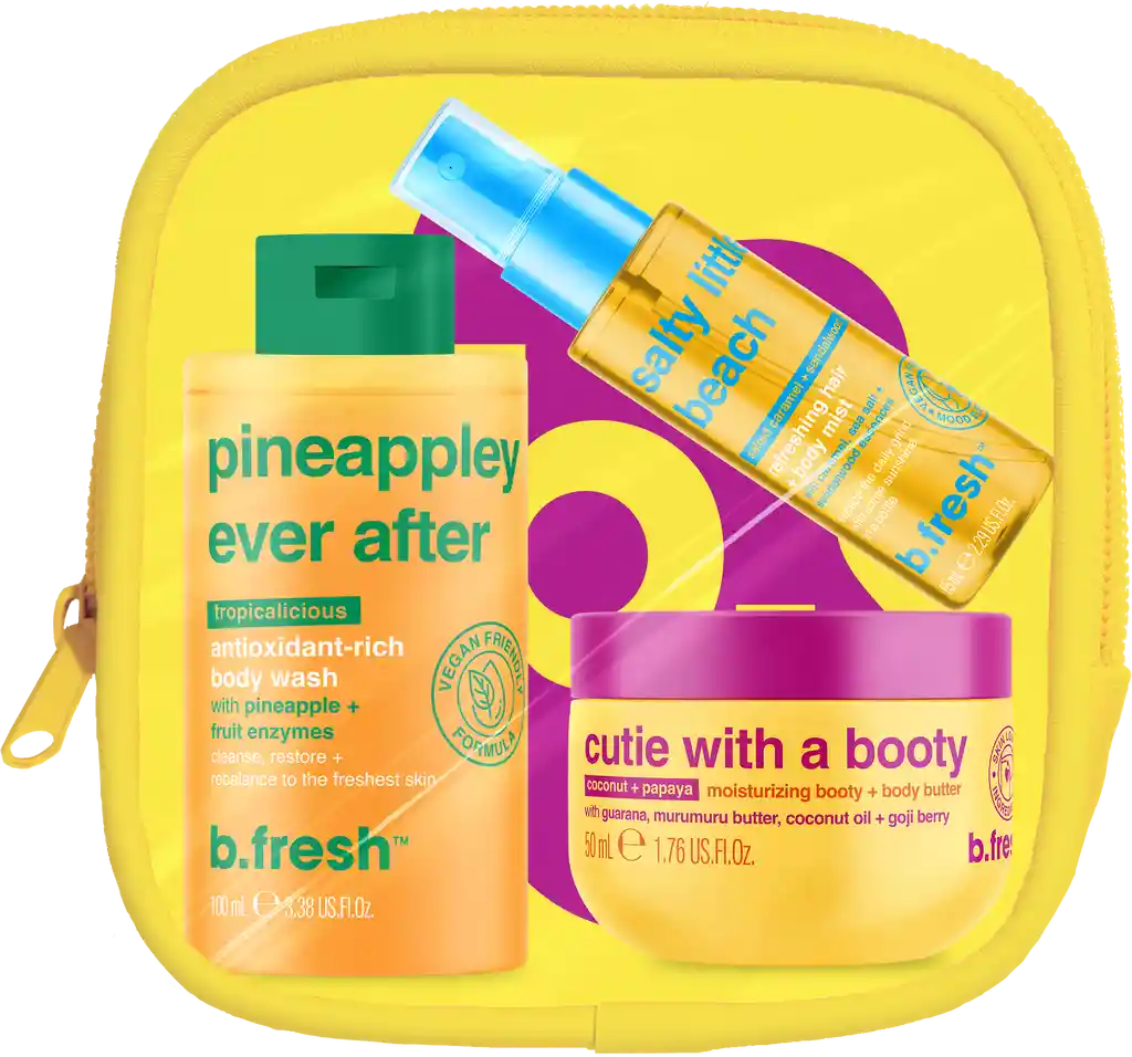 Set de regalo en formato travel con 3 esenciales para cuerpo y cabello. Incluye Pineappley Ever After Body Wash 100 ml, Salty Little Beach Hair + Body Mist 65 ml y Cutie with a Booty Body + Booty Butter 50 ml. Vegano, cruelty-free y apto para equipaje de mano.