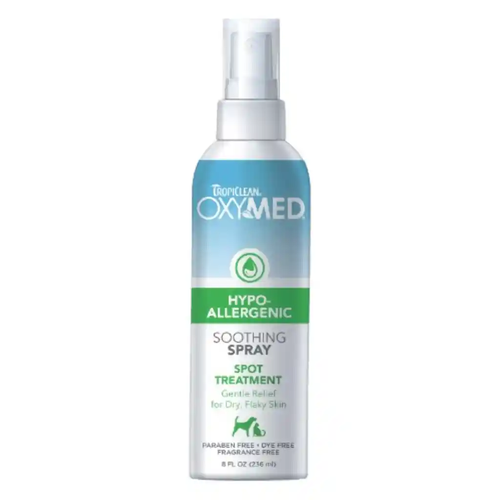 El spray calmante Hipoalergénico OxyMed es una solución inmediata para las mascotas con alergias y piel sensible. Está especialmente formulado para ayudar a reducir la hinchazón, el enrojecimiento y la caspa, mientras entrega un alivio inmediato de la picazón y las alergias. Es un producto suave, para ser usado también en cachorros y gatitos. Características principales: Suave y rápido alivio de la picazón en las mascotas con alergia o piel sensible. Tratamiento localizado, especialmente formulado para ayudar a reducir la hinchazón, el enrojecimiento y la caspa mientras alivia instantáneamente la picazón y las alergias de la piel. Alivio efectivo, su mezcla hipoalergénica única nutre, hidrata y calma suavemente la piel sensible. No tienes que preocuparte de que el spray pueda quitar tratamientos spot-on. Libre de Jabón, parabenos y colorantes. Seguro para perros y gatos de 12 semanas de edad en adelante. Modo de uso: Agita bien antes de cada uso. Rocía directamente en la piel afectada y masajea suavemente. Puede ser usado tan seguido como sea necesario para un alivio inmediato. Ingredientes: Agua purificada, harina de avena coloidal, proteína de trigo hidrolizada, alfa hidroxi, alcohol etanol, glicerina, vitamina E, conservante