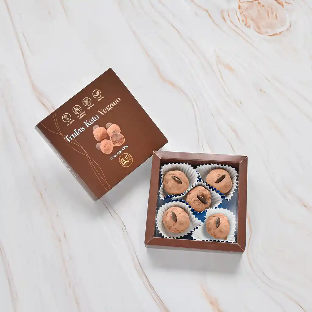 Caja con 5 unidades de trufas keto veganas. con crema de coco y chocolate 85% cacao, endulzadas con alulosa. Sin gluten, sin soya, sin huevo, sin leche, sin azucar. indulgentes, deliciosas y las preferidas de muchos para regalar o autoregalar.