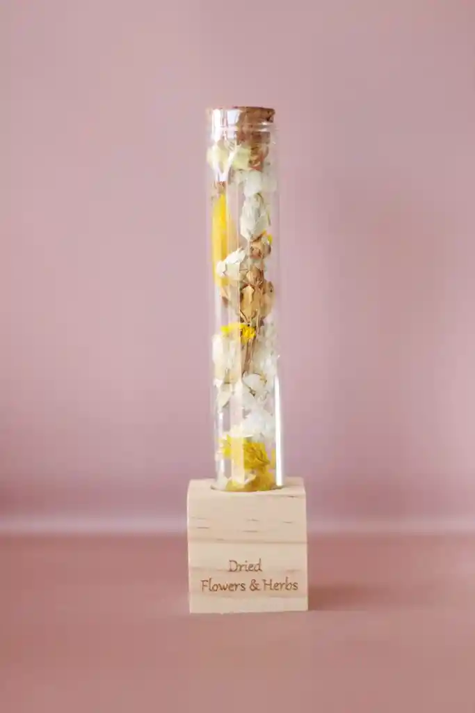 Soporte de madera diseñado para sostener 1 tubo de vidrio de diferentes tamaños rellenos con flores secas. Ideal para decorar tú casa. ¡Lleva la naturaleza al interior! Por tratarse de productos naturales y hechos a manos, nunca habrán dos tubos rellenos iguales. Nuestra base está creada de madera 100% certificada FSC®. Medida base madera: 4 x 4 cms / Medida total: Altura máxima 16.5 cms Todos nuestros productos secos y preservados han sido cuidadosamente seleccionados e importados desde Holanda para ti. Además todos han sido cultivados, cosechados y producidos de manera manual para garantizar la mejor calidad y color, respetando las normativas eco-sustentables europeas. Nuestros productos pueden durar varios años si se cuidan de la manera correcta; evitando el sol directo, cambios de temperaturas muy abruptos, exposición a espacios húmedos, contacto directo con el agua, inadecuada manipulación, entre otros.