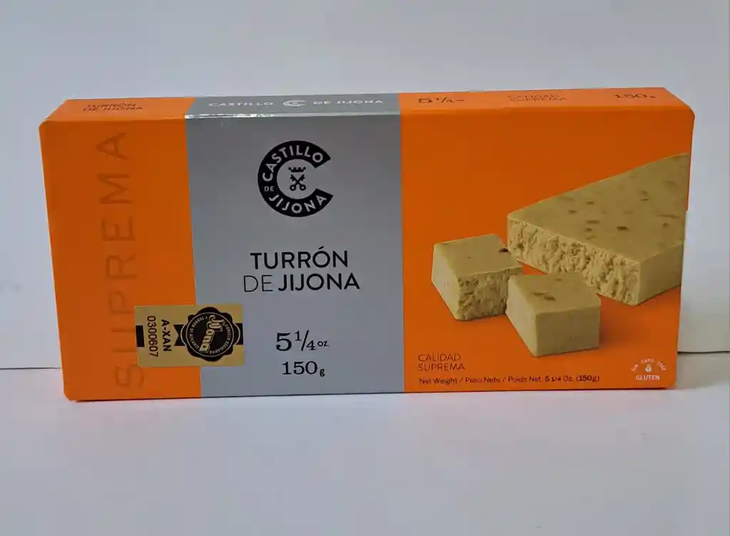 El turrón español es una masa dulce obtenida por la cocción de miel (o azúcares) a la que se incorporan almendras peladas y tostadas. 150g