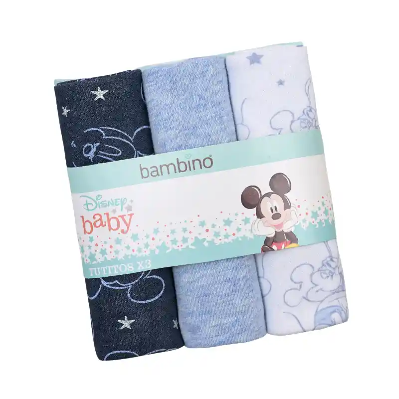 Especificaciones: Marca: Bambino Material: 50% Poliester y 50% Algodón Género: Niña / Niño Color: Set Mickey (Según Disponibilidad) Tamaño: 60 x 40 cm aprox. Contenido: 3 Tutitos Características: Tutos suaves y livianos. Ideales para que tu bebé juegue y se convierta en su tuto regalón.