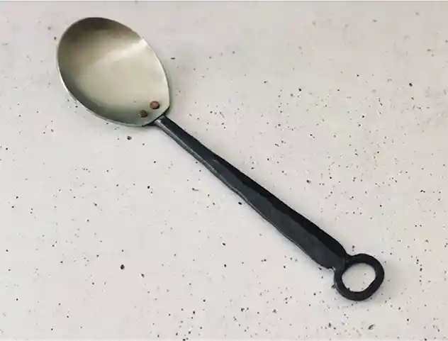 Utensilios rústicos de acero inoxidable y mango de hierro rústico. Ideal para colgar de barras y lucirlas. Van en cajas de cartón blanco. La cuchara mide : 27.5 x 2 cm