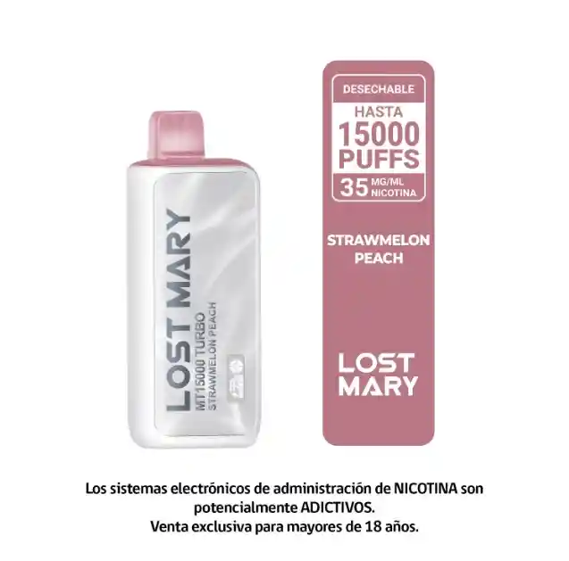 Vape Lost Mary - MT 15.000 Turbo. Vaporizador desechable, que viene cargado con E-liquid, listo para usar. Equipo Lost Mary es desechable y con nicotina. Capacidad: 16 ml. Aproximadamente 15.000 puffs. Contenido Nicotina: 35 Mg / Ml. Sabor: Strawmelon Peach (Frutilla Sandia y Durazno). Características: - Vaper de gran calidad, colorido, compacto y muy versátil. - Boquilla ergonómica y cómoda. - Pantalla digital, Indica el nivel de batería y e-líquido restante. - Modo Turbo, se generan nubes mas densas y grandes