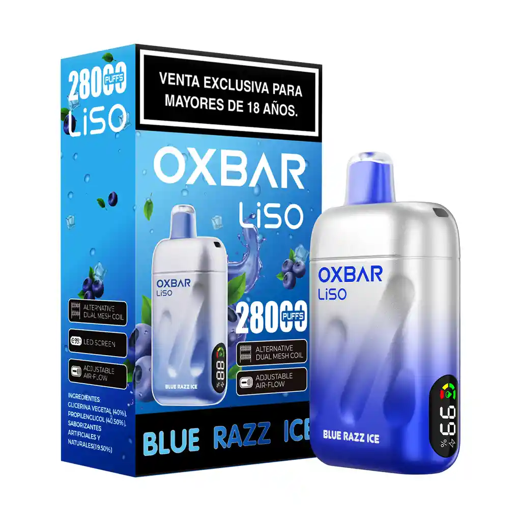 Sabor: Arandanos ice Información del Oxbar Liso 28000 Puffs – Blue Razz Ice: Capacidad de 20 ml, equivalente a 28.000 puffs Pantalla inteligente con indicador de líquido y batería Potencia: 4.5% Batería de 650 mAh Recarga USB-C Resistencia 1.2 ohm Dual Mesh Coil Sistema de ajuste de flujo de aire