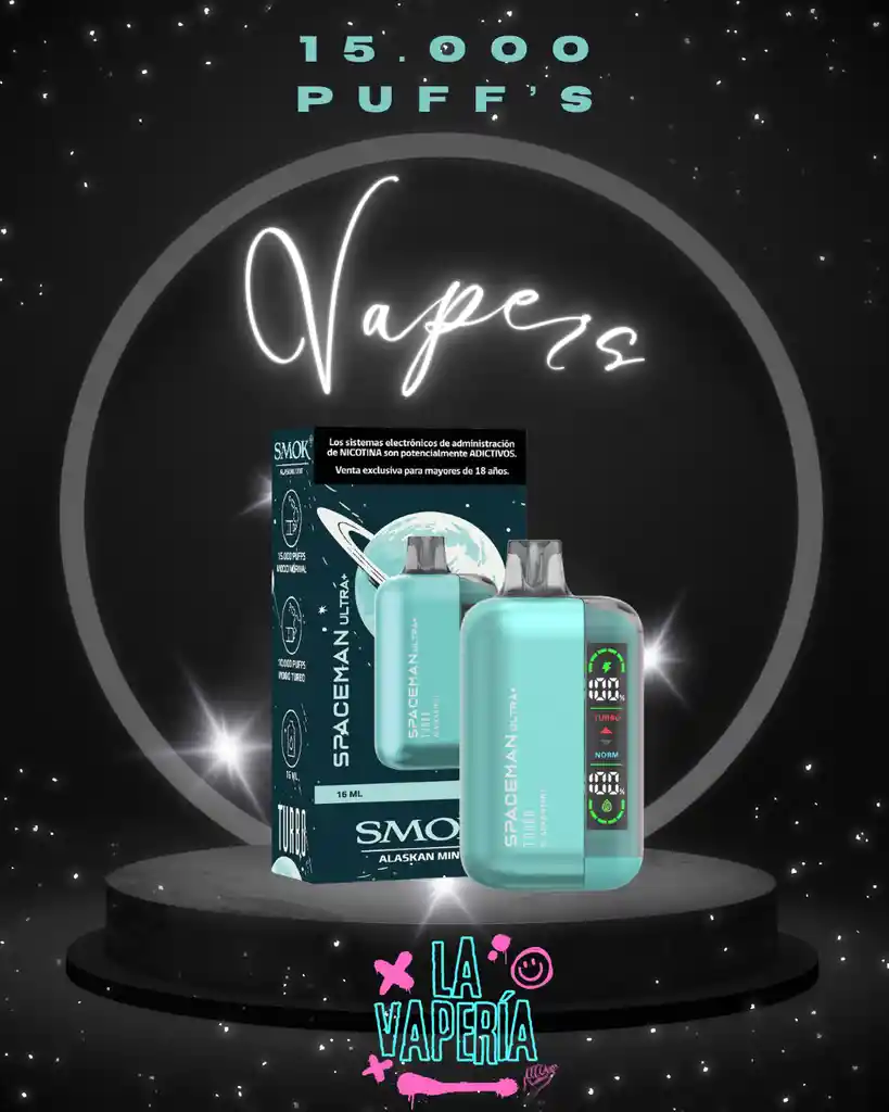 Desbloquea una experiencia más interactiva con el Vaper desechable Spaceman ULTRA+ Incorporando en su diseño una pantalla de 1.91 pulgadas esta pantalla está dedicada a desplegar información en tiempo real del estado de batería y del líquido en tu vaporizador, permitiendo también elegir entre el modo TURBO y NORMAL. Modo TURBO: Con el modo turbo puedes experimentar una calada repleta de sabor gracias a las nubes grandes de vapor que también te darán un mejor golpe de garganta. Ideal para quienes buscan un sabor más intenso y mayor vapor. Usar este modo de manera prolongada reduce la cantidad de puffs por su mayor consumo de e-liquid y batería. Modo NORMAL: Este modo te hará experimentar una sensación de vapeo suave y delicada con nubes de vapor moderadas, perfecta para quienes no quieren golpes fuertes en la garganta y buscan nubes moderadas de vapor. Este modo te dará hasta 15.000 Puffs. Además incluye una batería de 800mAh ideal para asegurar una larga duración, y no te preocupes ya que es recargable mediante su puerto USB – C. Tiene en su parte inferior un ajuste de aire para personalizar la potencia de calada de tu preferencia. Posee también una resistencia tipo mesh que hará cada puff una fumada llena de sabor.