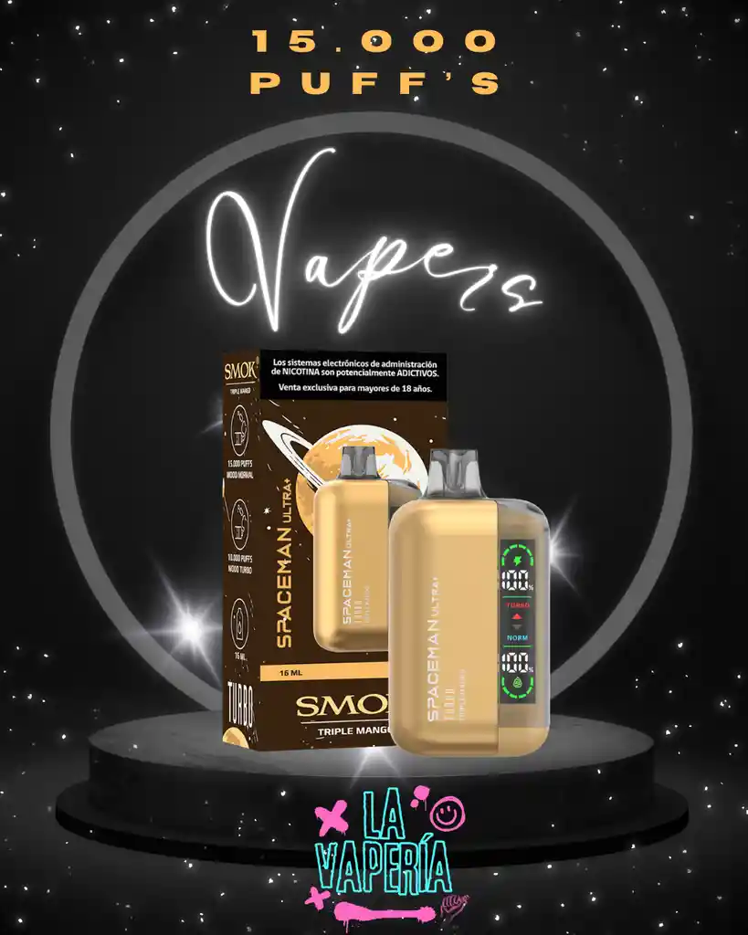 Desbloquea una experiencia más interactiva con el Vaper desechable Spaceman ULTRA+ Incorporando en su diseño una pantalla de 1.91 pulgadas esta pantalla está dedicada a desplegar información en tiempo real del estado de batería y del líquido en tu vaporizador, permitiendo también elegir entre el modo TURBO y NORMAL. Modo TURBO: Con el modo turbo puedes experimentar una calada repleta de sabor gracias a las nubes grandes de vapor que también te darán un mejor golpe de garganta. Ideal para quienes buscan un sabor más intenso y mayor vapor. Usar este modo de manera prolongada reduce la cantidad de puffs por su mayor consumo de e-liquid y batería. Modo NORMAL: Este modo te hará experimentar una sensación de vapeo suave y delicada con nubes de vapor moderadas, perfecta para quienes no quieren golpes fuertes en la garganta y buscan nubes moderadas de vapor. Este modo te dará hasta 15.000 Puffs. Además incluye una batería de 800mAh ideal para asegurar una larga duración, y no te preocupes ya que es recargable mediante su puerto USB – C. Tiene en su parte inferior un ajuste de aire para personalizar la potencia de calada de tu preferencia. Posee también una resistencia tipo mesh que hará cada puff una fumada llena de sabor.