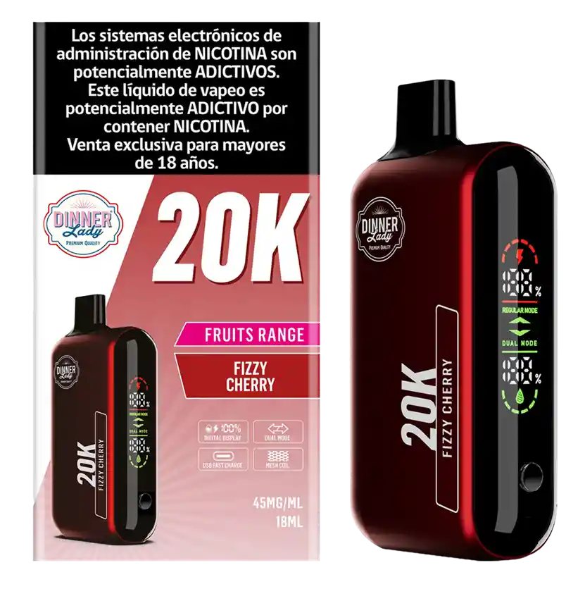 El nuevo Dinner Lady 20K es un vaporizador desechable recargable diseñado para quienes buscan máximo rendimiento, sabor intenso y control total. Con una batería recargable de 850 mAh, ofrece hasta 20.000 caladas gracias a su eficiente sistema de doble modo: Modo Regular: ideal para el vapeo diario. Modo Dual: para un golpe más potente y sabores intensificados. Su pantalla digital muestra en todo momento el nivel de batería, cantidad de líquido y el modo activo, permitiendo una experiencia más precisa y personalizada. Además, su puerto USB-C garantiza una carga rápida y eficiente. ______________________________________________________ Sabores favoritos del mercado: Fizzy Cherry: cerezas dulces con un toque chispeante de gaseosa. Pineapple Ice: piña tropical jugosa con final frío y refrescante. Triple Mango: tres variedades de mango dulces con un cierre mentolado. Sour Apple Ice: manzanas verdes ácidas sobre fondo de hielo. Watermelon Bubblegum: jugosa sandía combinada con el sabor clásico del chicle. ______________________________________________________ Características destacadas: Hasta 20.000 caladas. Sal de nicotina de 45mg. Pantalla digital con indicador de batería y e-liquid. Modo dual: Regular y Dual Mode. Puerto de carga USB-C. Sistema de cambio de modo con un solo botón