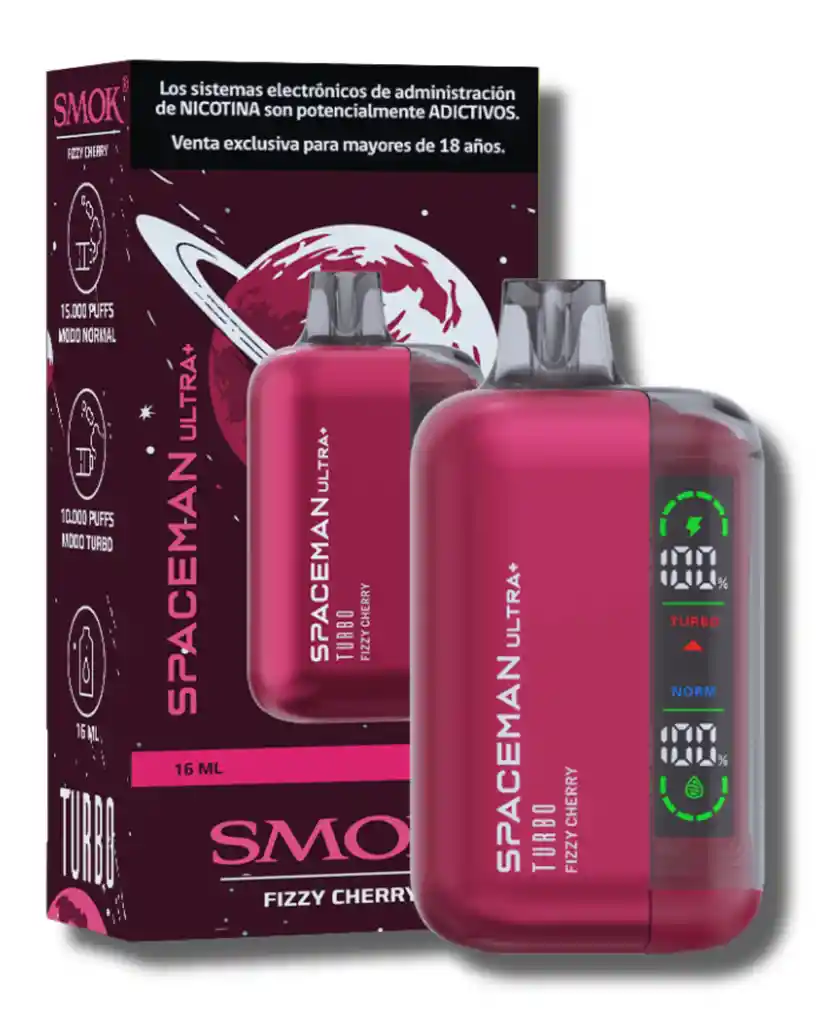 Desbloquea una experiencia más interactiva con el Vaper desechable Spaceman ULTRA+ , incorporando en su diseño una pantalla de 1.91 pulgadas, esta pantalla está dedicada a desplegar información en tiempo real del estado de batería y líquido en tu vaporizador, permitiendo también elegir entre el modo TURBO y NORMAL. Modo TURBO: Con el modo turbo puedes experimentar una calada repleta de sabor gracias a las nubes grandes de vapor que también te darán un mejor golpe de garganta. Ideal para quienes buscan un sabor más intenso y mayor vapor. Usar este modo de manera prolongada reduce la cantidad de puffs por su mayor consumo de e-liquid y batería. Modo NORMAL: Este modo te hará experimentar una sensación de vapeo suave y delicada con nubes de vapor moderadas, perfecta para quienes no quieren golpes fuertes en la garganta y buscan nubes moderadas de vapor. Este modo te dará hasta 15000 Puffs. Además incluye una batería de 800mAh ideal para asegurar una larga duración, y no te preocupes ya que es recargable mediante su puerto USB – C Tiene en su parte inferior un ajuste de aire para personalizar la calada a tus preferencias. Posee también una resistencia tipo mesh que hará cada puff una bocanada llena de sabor. 15 sabores disponibles: ALASKAN MINT: Disfruta de la frescura intensa con este sabor a menta helada. HONOLULU BLUE: Una exótica mezcla de frutas tropicales que te darán las mejores olas de sabor. FIZZY CHERRY: Disfruta una explosión de sabor refrescante y dulce, con cerezas y toque burbujeante , sentirás algo similar al sabor bebida! TRIPLE MANGO: Sabor clásico a verano, con toques dulces y ácidos! CHERRY PARADISE: Un paraíso de cerezas dulces y jugosas. FLORIDA LEMONADE: Limonada fresca y ácida con un toque dulce perfecto! PEACH BERRY ICE: Durazno dulce y jugoso con berries silvestres, refrescante con un toque ice al final. DRAGON FRUIT PEAR: La mezcla perfecta y única entre peras y fruta del dragón. Un sabor refrescante y dulce. PEACH BERRY ICE: Durazno dulce con un toque de berries naturales y un final frío. BLUE RAZZ LEMON: Frambuesa azul y un toque final de limón cítrico, el sabor más vibrante y refrescante! DR. CHERRY: Perfecto para los antojos de los amantes del dulce, cerezas dulces. ROOT BEER: Un sabor clásico y muy peculiar, el verdadero sabor tradicional de la cerveza americana. TRIPLE CITRUS: Disfruta de esta mezcla cítrica de naranja, limón y pomelo. ¡ El más refrescante y energizante sabor! TRIPLE APPLE ICE: Inigualable sabor intenso de manzana con un toque crujiente y helado. WATERMELON KIWI: La mejor sandía dulce y refrescante con un toque ácido de Kiwi. Esta es una mezcla perfecta para el verano. STRAWBERRY MINT CANDY: Caramelo de frutilla y menta, un sabor refrescante, dulce y mentolado! A pesar de su capacidad de 15000 Puff , tiene un tamaño perfecto para el encaje de la palma, haciéndolo ideal para usar en el día a día sin preocupaciones por peso o tamaño excesivo. ESPECIFICACIONES : Modo Normal 15000 Puff / Modo Turbo 10000 Puff Batería de 800mAh 16 sabores disponibles Puerto de carga USB – C Resistencia tipo mesh Flujo de aire ajustable E-liquid 16ml Salt Nic 2% Pantalla de 1 pulgada incorporada